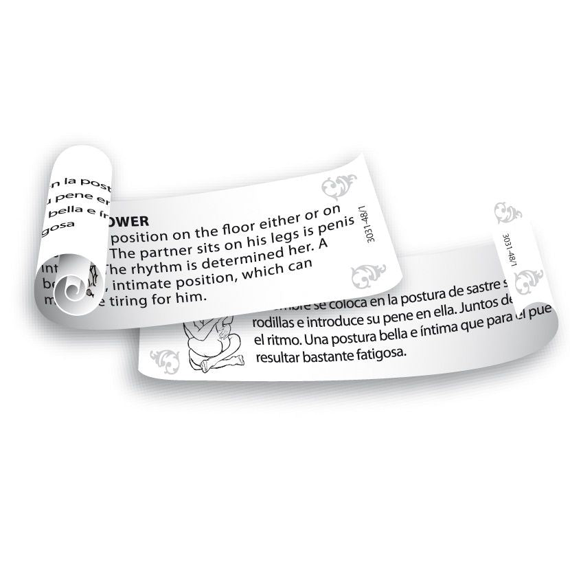 Una sensazione per te e il tuo partner! Usando le pinzette, prendi una pergamena dal cuore. Quale posizione erotica proverai? Sarà il giro della dea, la barca dell'amore o l'adorazione? Accettate la sfida e sperimentate insieme il piacere e l'intimità.